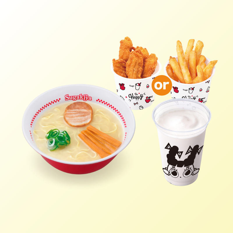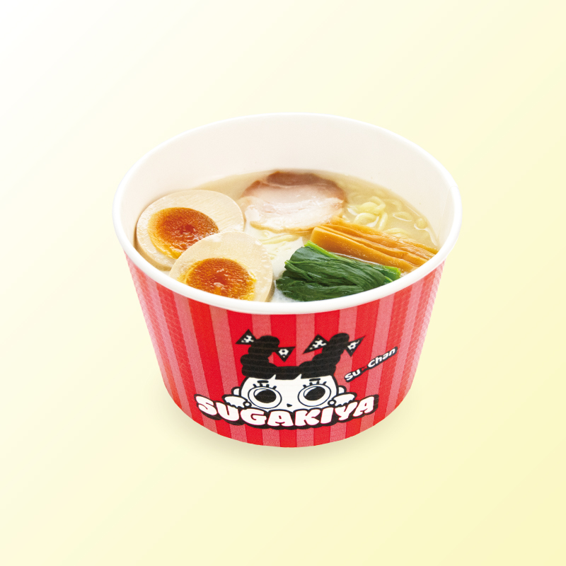 甘党やスナックなどカフェタイムに限定商品が楽しめる新しいスガキヤ。ところどころにスーちゃんのモチーフが散りばめられた、レトロなカフェテイストの空間デザインもミックスした写真映えする空間にもこだわりました。スガキヤのラーメンをよりスナック感覚で手軽かつカジュアルに食べていただけるよう、器もリニューアルしました。