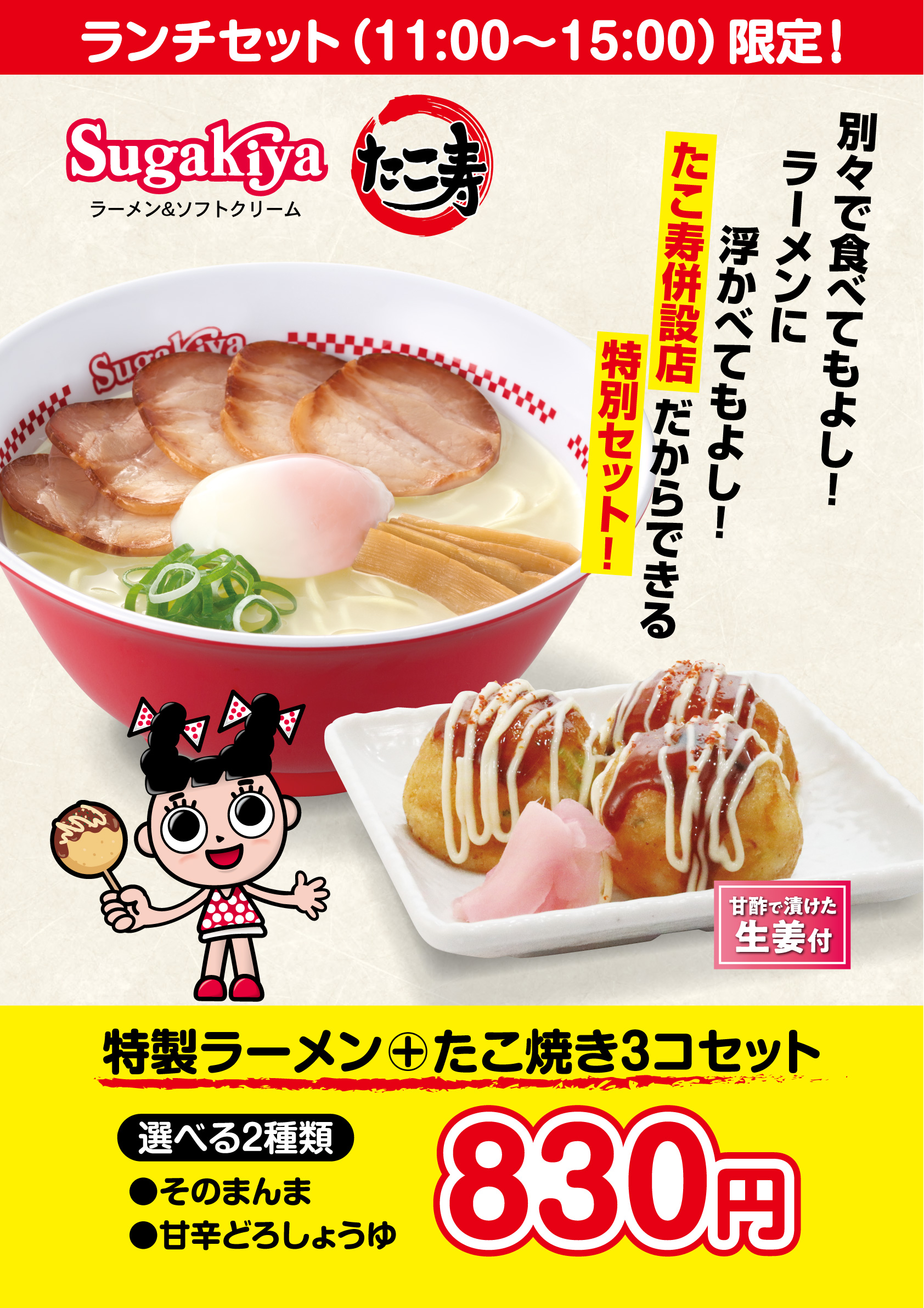 スガキヤで定番人気の「特製ラーメン」と、たこ寿併設店にしかないたこ焼きが一緒に食べられる、どちらも楽しみたい方におすすめのセットです。
