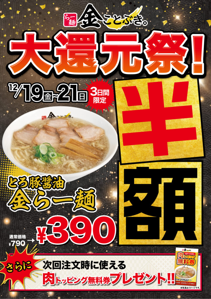 【金ことぶき。】12月19日(金)より「金らー麺」が半額になる大還元祭開催!