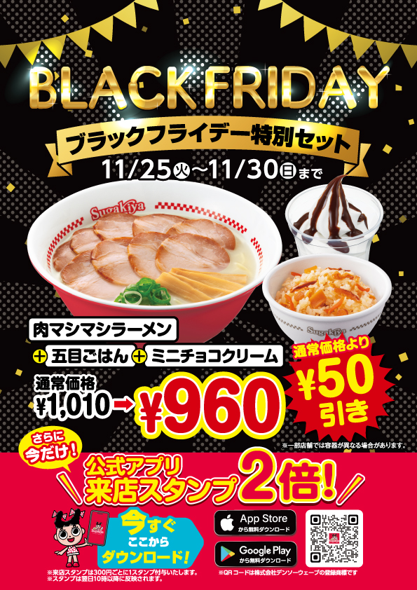 スガキヤでは2025年11月25日(火)〜11月30日(日)まで、「ブラックフライデー特別セット」の販売とアプリ会員様には来店スタンプ2倍キャンペーンを実施いたします。