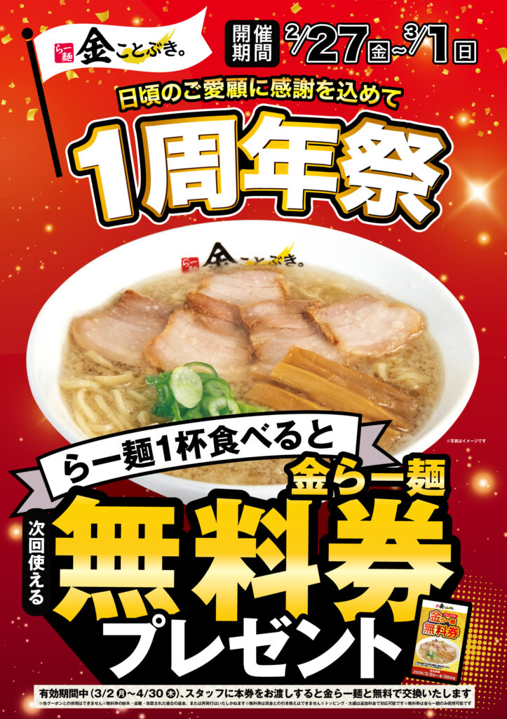 【金ことぶき。】2月27日(金)より1周年祭を開催!一杯ご購入で次回「金らー麺」が無料