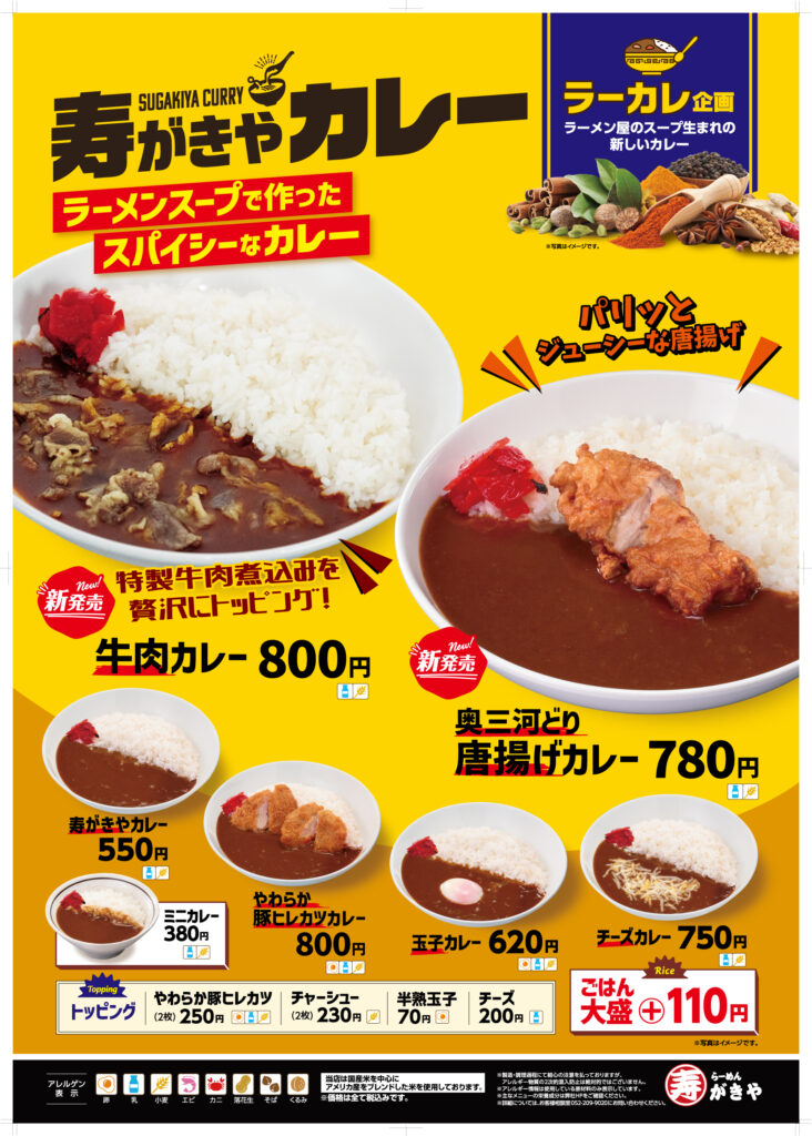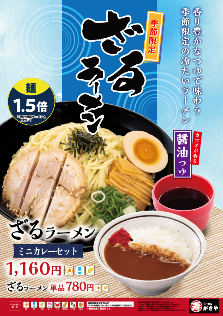 「寿がきや」では2026年3月26日(木)より、春夏の人気メニュー「ざるラーメン」に加え、ボリューム満点の「牛肉カレー」「奥三河どり唐揚げカレー」を販売いたします。