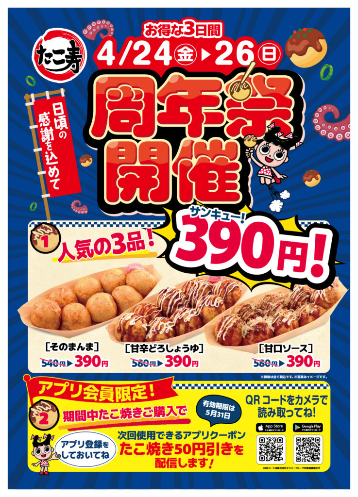 4月24日(金)より日頃の感謝を込めて、 3日間限定で人気のたこ焼きの特別価格販売や、アプリ会員様だけの嬉しいキャンペーンが登場する「たこ寿周年祭」を開催します。