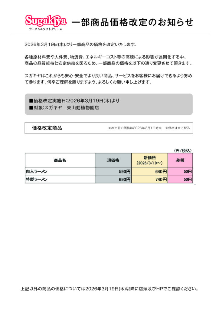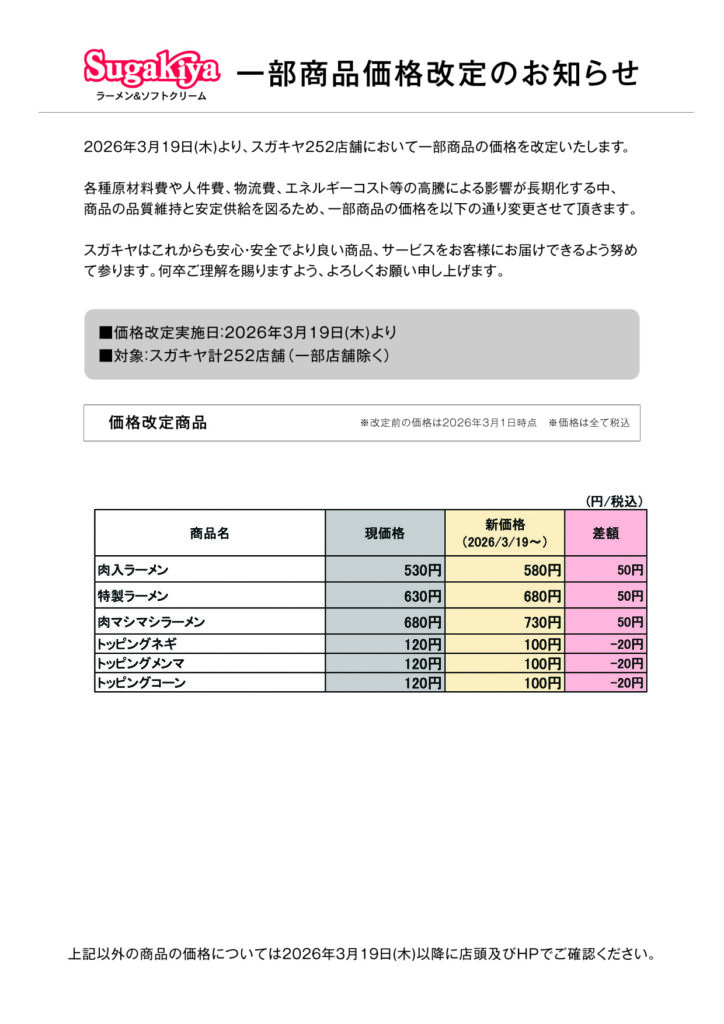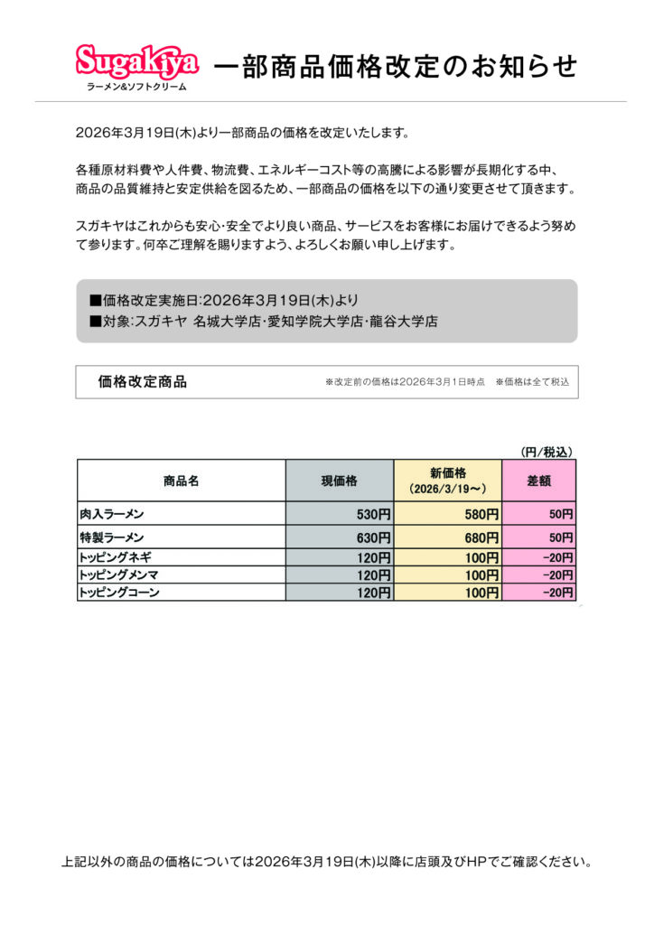 この度スガキヤ全店において、2026年3月19日(木)より、価格改定を行うことになりましたのでお知らせいたします。各種原材料費や人件費、物流費、エネルギーコスト等の高騰による影響が長期化する中、商品の品質維持と安定供給を図るため、一部商品の価格を変更させて頂きます。
