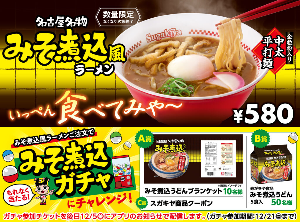アプリ会員証をご掲示のうえ、12月3日(水)までにみそ煮込風ラーメンをご注文いただいた方に、もれなく全員に当たる「みそ煮込ガチャ」にチャレンジいただけます。