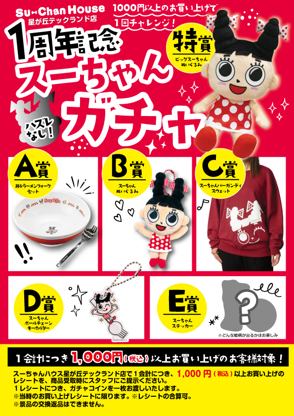 ハズレなし!1周年スーちゃんガチャも同時開催!!